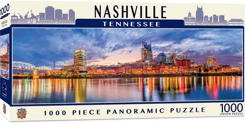 This MasterPieces 1000pc 13" x 39" Nashville Panoramic Puzzle is a great way to learn more about America, and have fun in the process! This amazing view of downtown Nashville and the iconic "Batman" building over the Cumberland River captures a clear evening sunset. To reduce its impact on our environment, the chipboard used in this puzzle is made of recycled material.