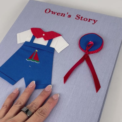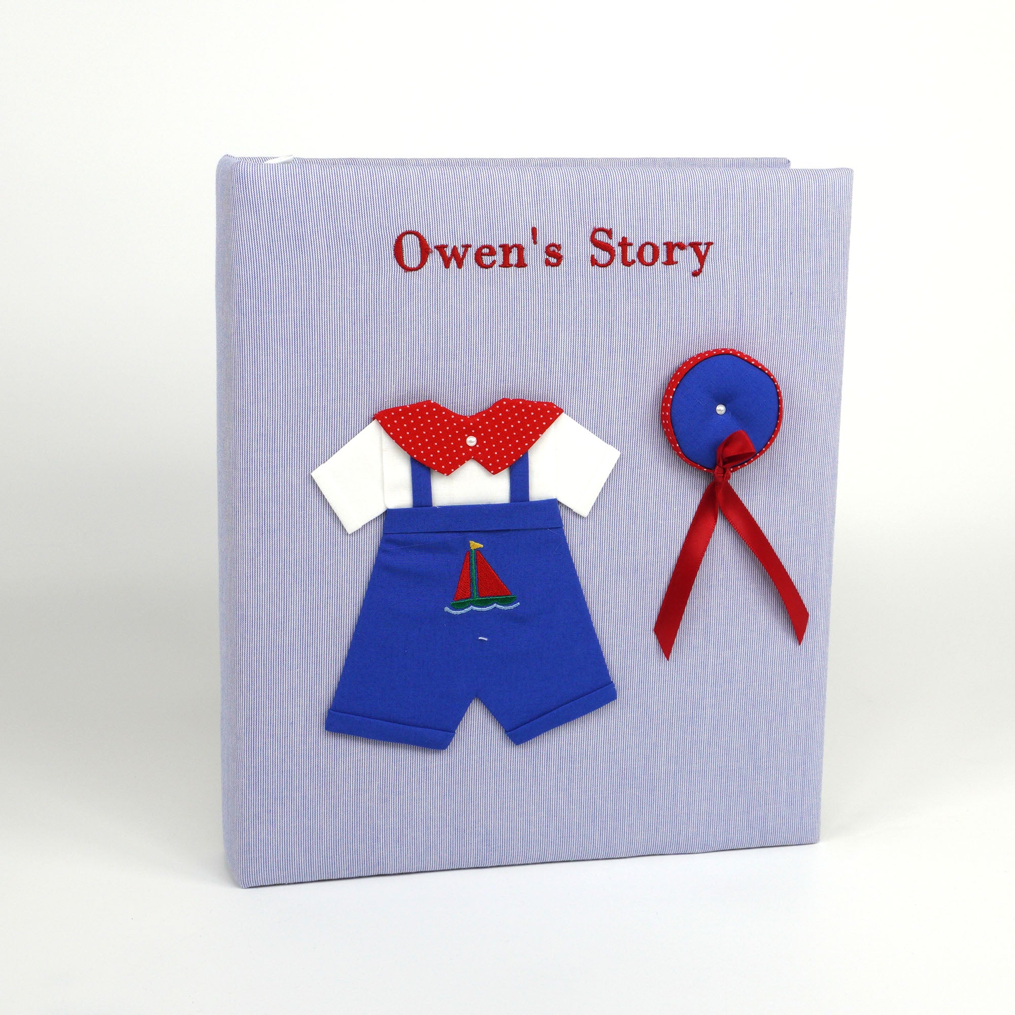 This memory book features an adorable baby boy jumper embellishment. It comes in a fabric-covered three-ring binder measuring 10" x 11.75" and includes 66 illustrated pages to record important events, along with 14 blank pages for additional memories. Personalize with a name, monogram or initials.