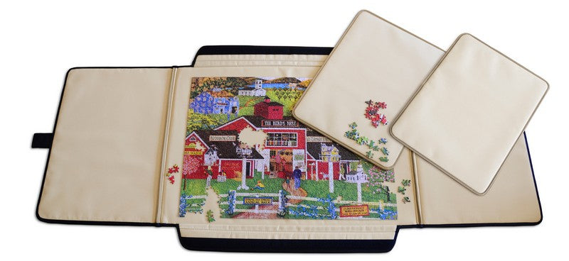 Designed for puzzle lovers, this jumbo fabric portfolio style puzzle table 22.83"x31.89", has a clean and dedicated surface to sort and build your puzzles without taking over your dining room table. The smooth surface lets you easily move pieces around and the additional inserts are great for sorting and storing. When you are temporarily done working on your puzzle, stack the inserts on top of your puzzle, fold, and secure your MasterPieces in progress with sturdy hook and loop closures. The closed design keeps your puzzle pieces and progress safe. The low-profile design allows for easy storage under a couch or bed. No assembly required.