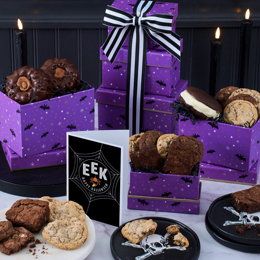 Treat your favorite ghouls and ghosts to a spooktacular surprise with our Seasonal Baked Goods Gift Tower! This hauntingly delightful gift tower is sure to bring screams of joy to any Halloween-loving person. The tower features two delectable mini bundt cakes, sinfully rich fudge brownies, delicious and decadent cookies, and a classic whoopie pie that epitomizes sweet perfection. Each bite is ghoulishly good! It's a Halloween gift better than trick-or-treating itself! Perfect for indulging in spooky stories by candlelight or sharing with friends at a ghoulish gathering, our Seasonal Baked Goods Gift Tower is the ultimate treat for Halloween. Don't miss out on this scary good delight—order now and make Halloween memorable! * Card shown not included