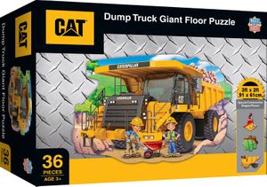 This Caterpillar puzzle features a giant yellow CAT dump truck, and construction workers ready to get the job done! This MasterPieces Caterpillar 36pc Floor Puzzle is great for children 3 and up. This giant 36 piece Shaped Floor puzzle has special construction-shaped pieces cut right into it. Can you find the tire-shaped piece?